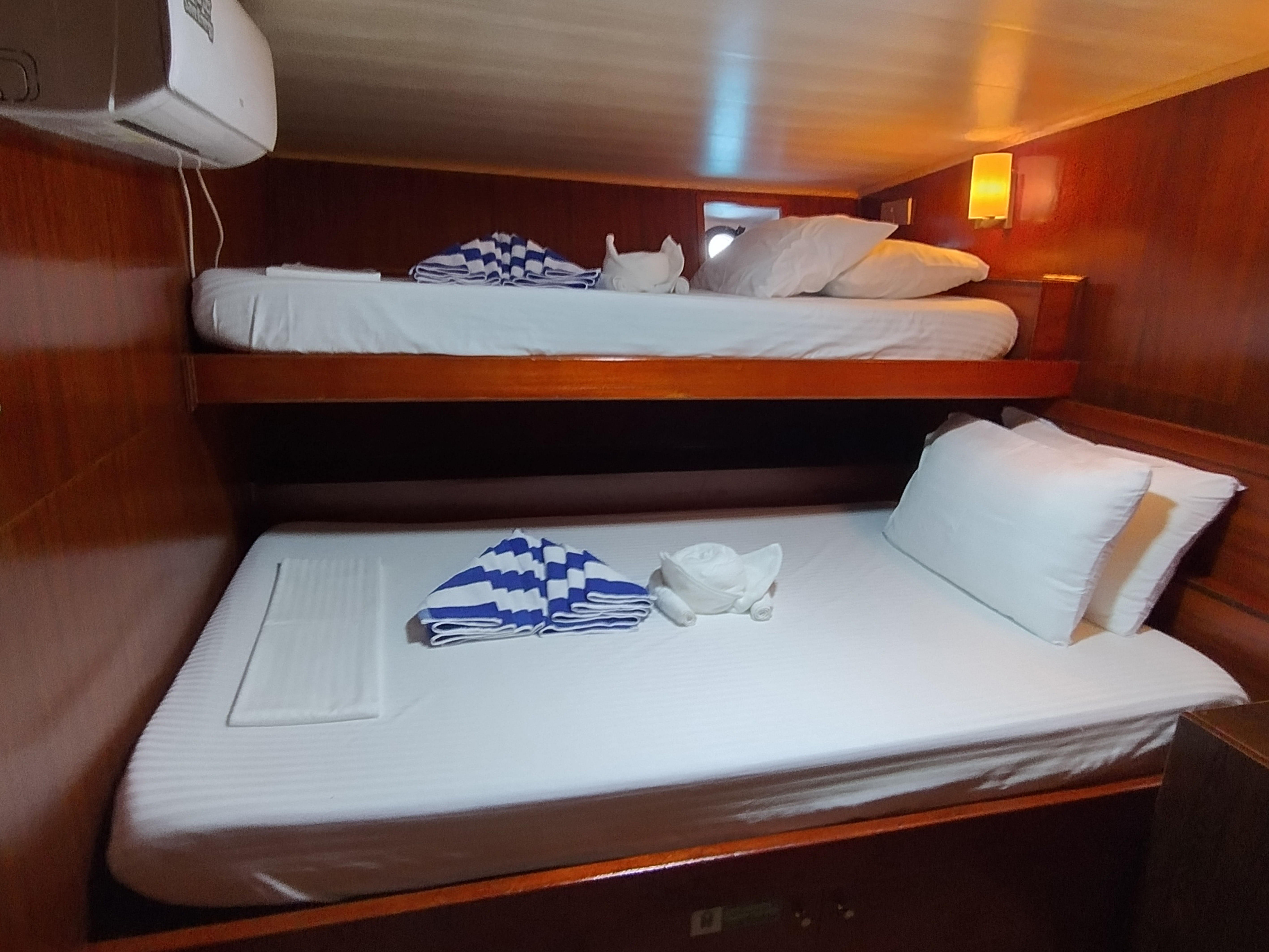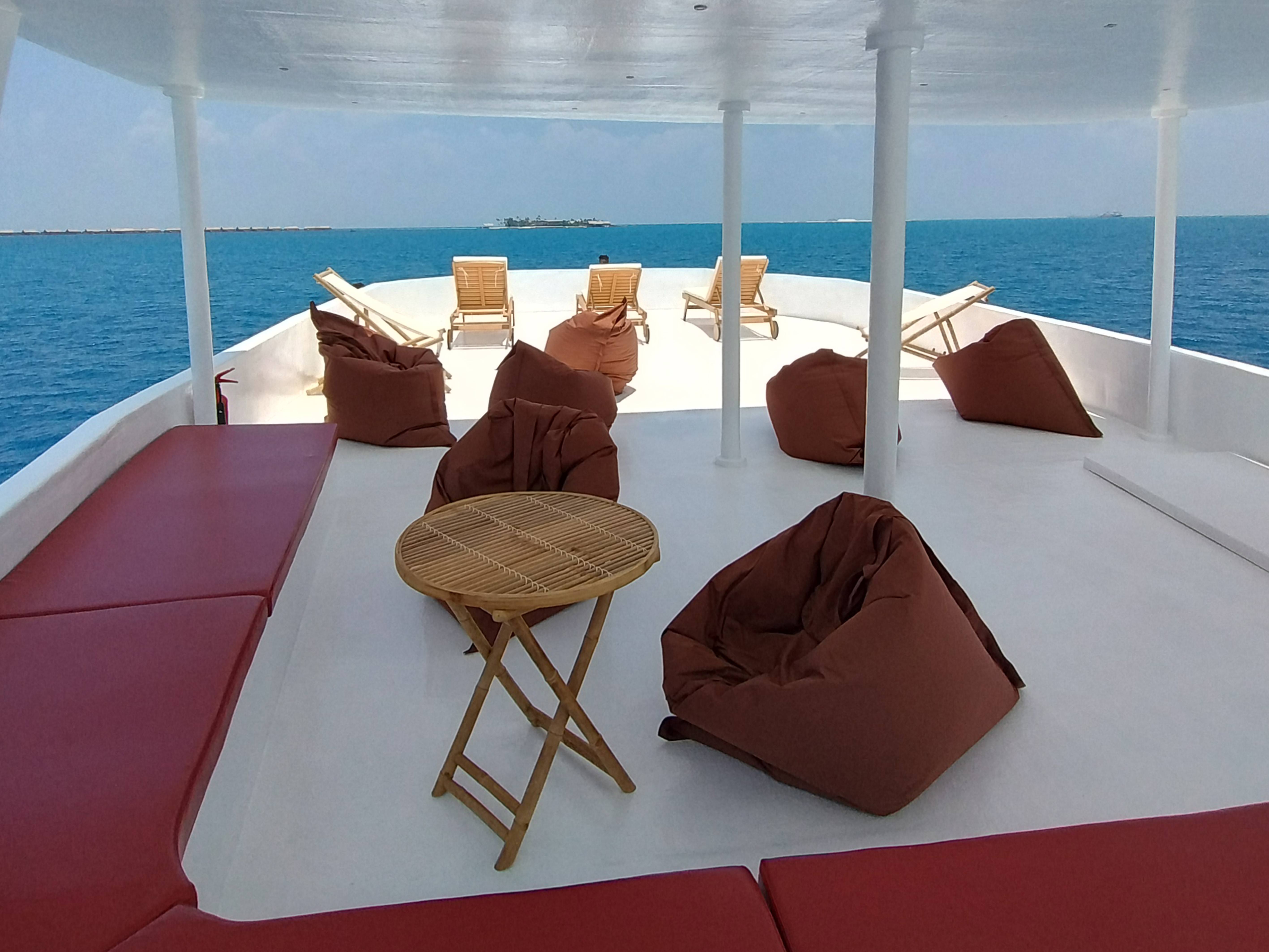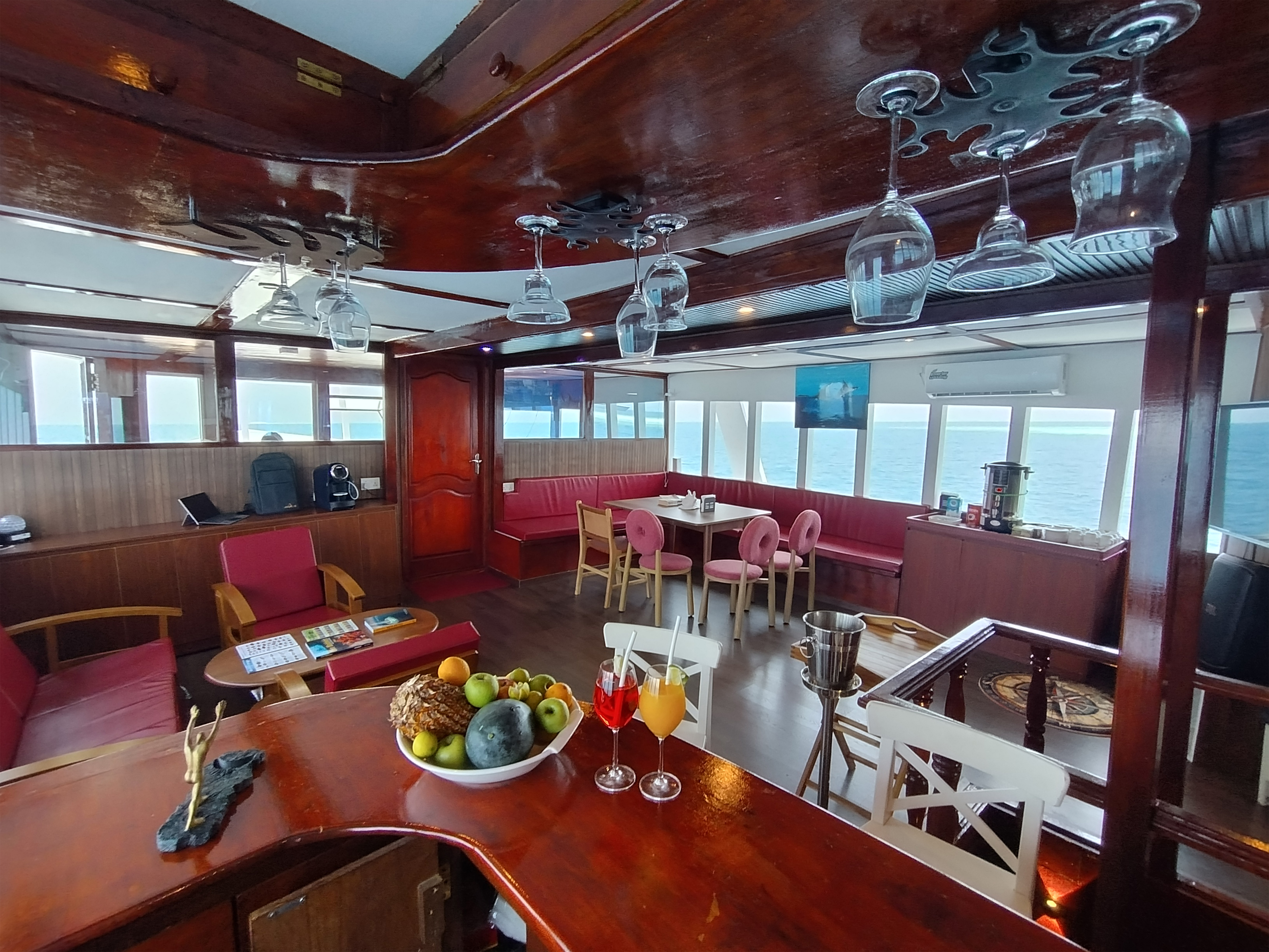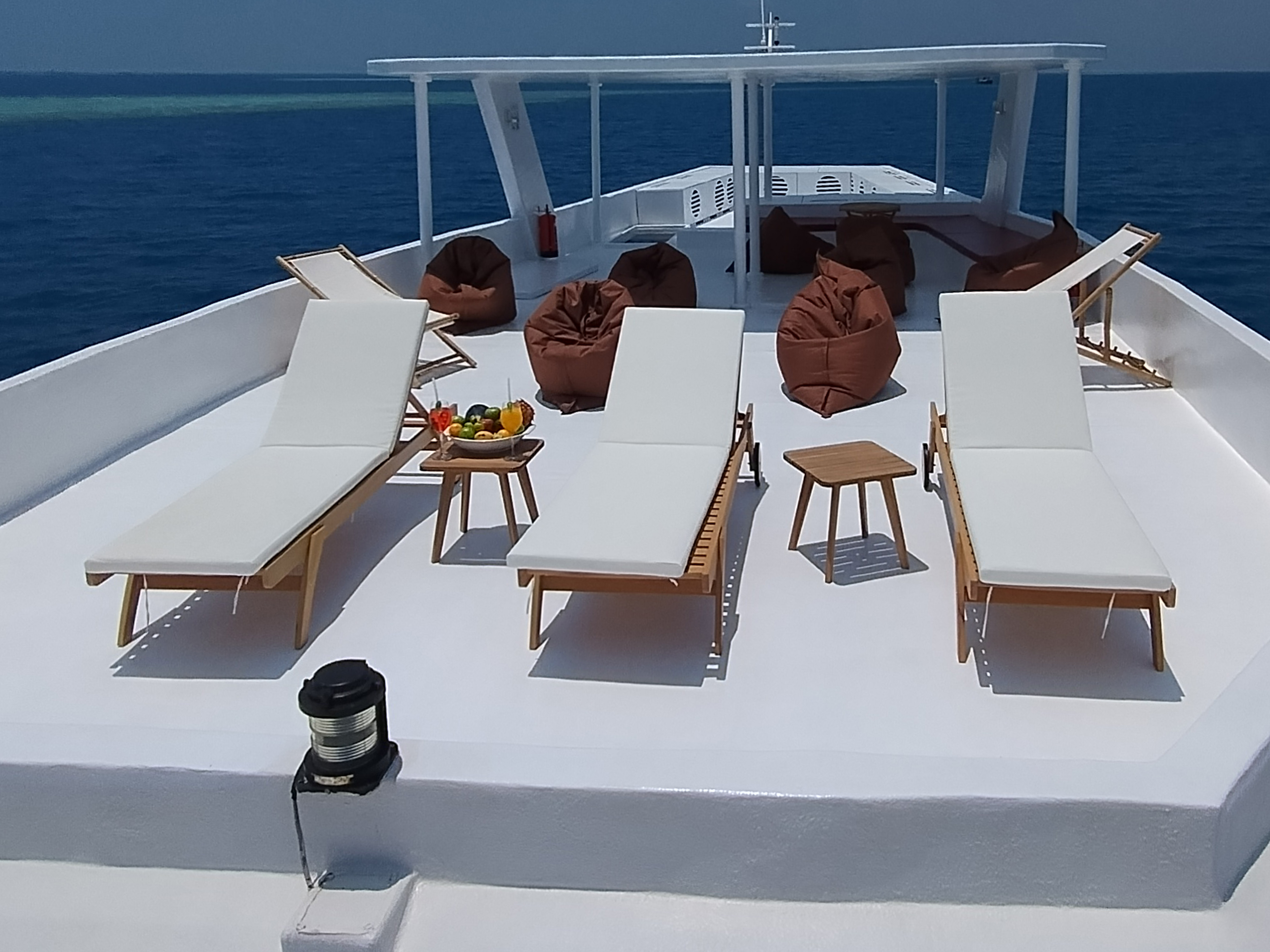 This Safari Vessel will provide 6 luxurious bed rooms of approximately 12 sq.metres each. All of these cabins are fully air conditioned and have attached toilets and showers with hot and cold water available at all times. There is a separate private room for dive instructors or surf guides with all facilities as guest rooms.